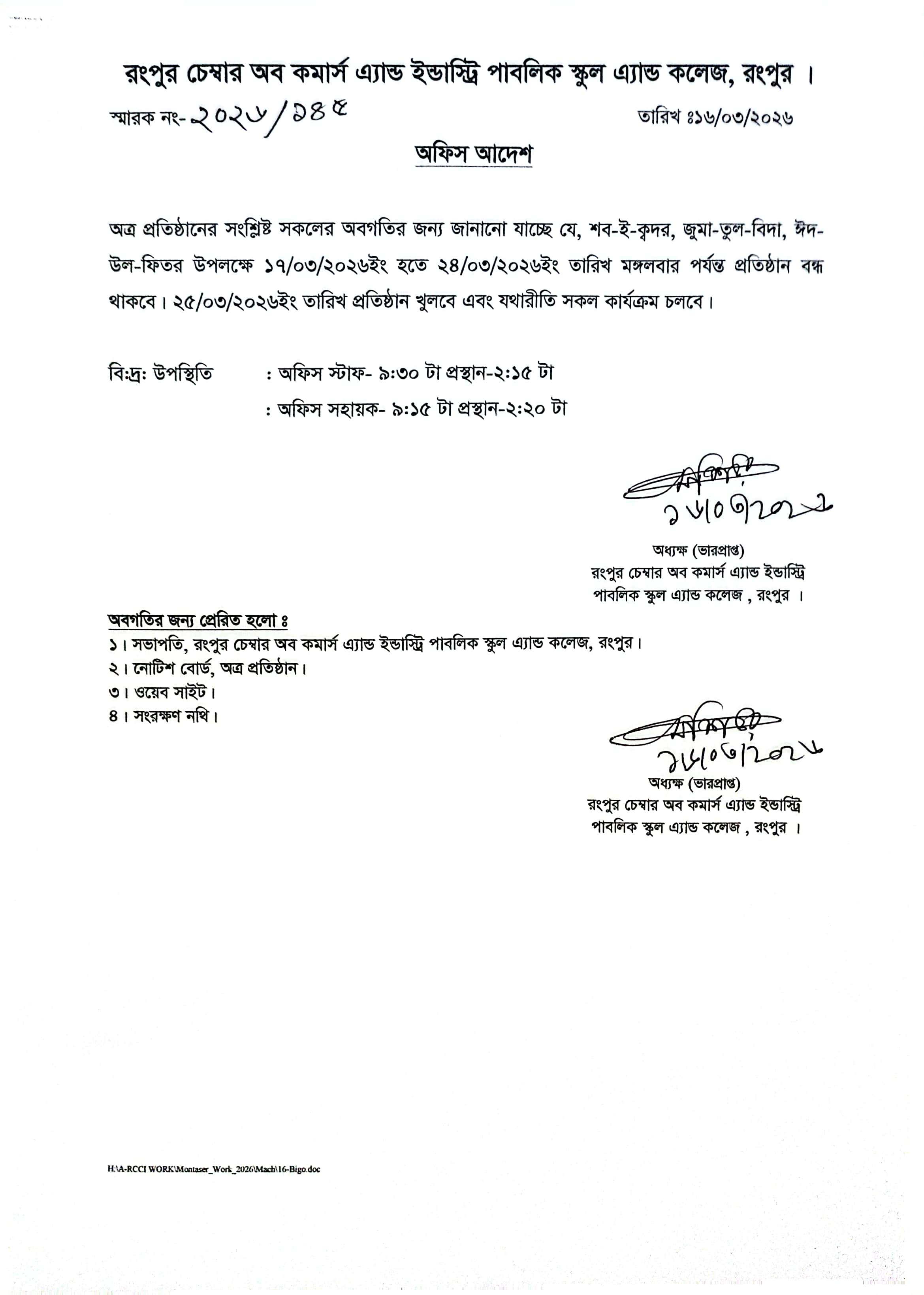 ঈদ উল ফিতর-২০২৬ এর ছুটির বিজ্ঞপ্তি